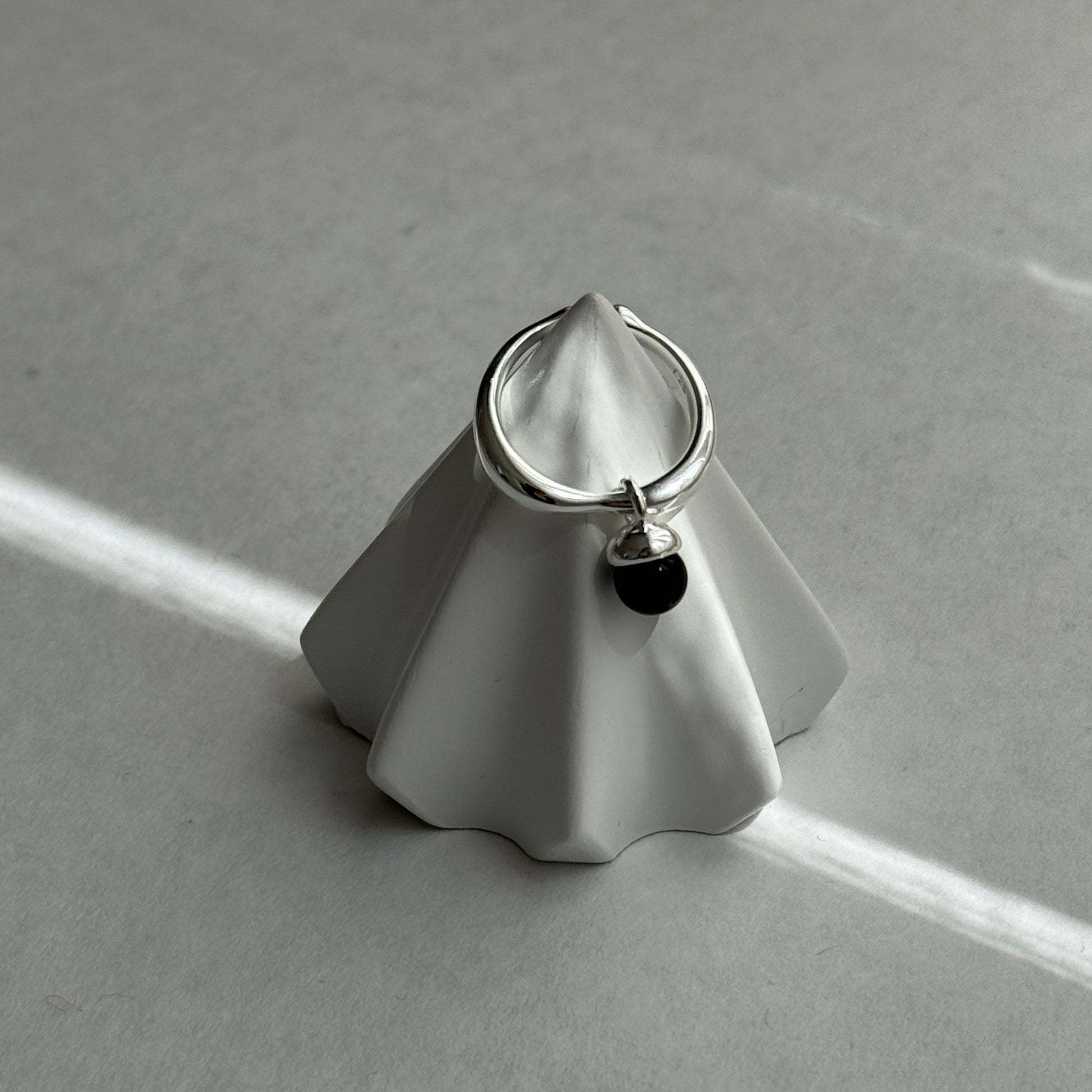 艶やかなブラックストーンのチャームがついたシルバーリング。モノトーンながらもミニマルなデザインはハードになりすぎず、万能なアイテム。