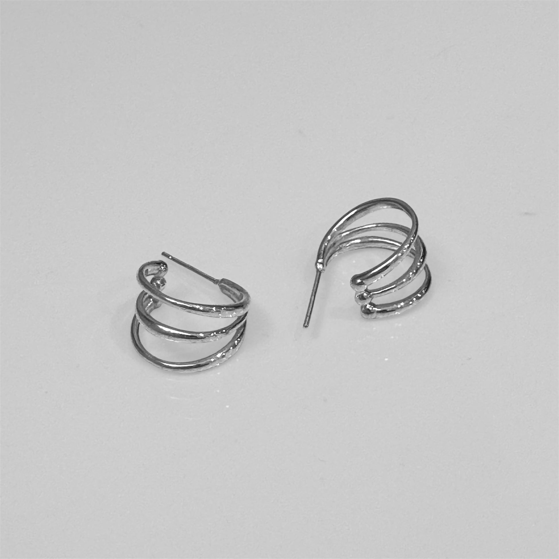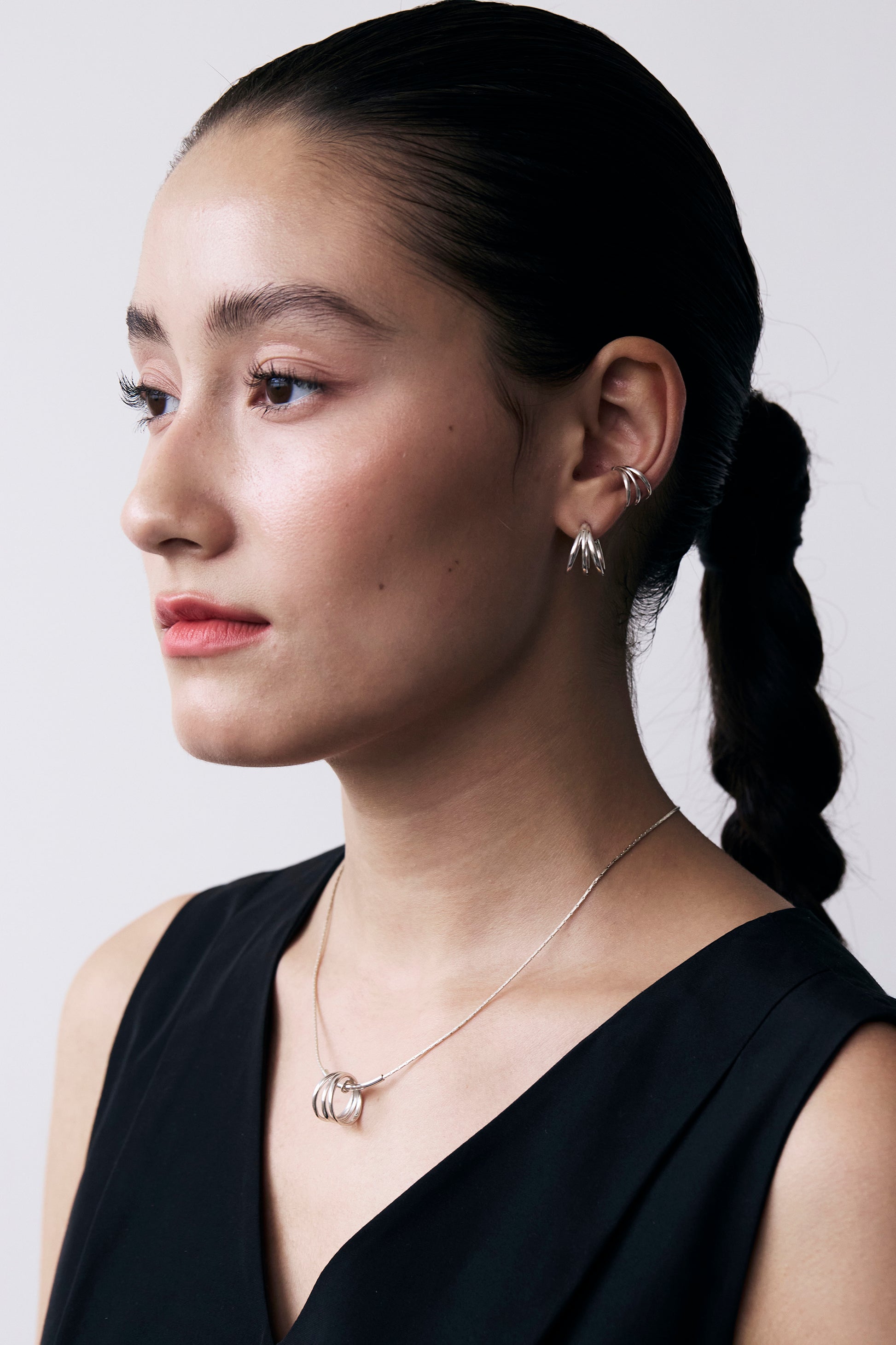 淡く、そして深く、立体的に交差する3本のラインが、墨の広がる波紋を思わせるようなピアス。程よいボリューム感ながら、重なり合う陰影が、耳元にしっかりとした存在感を宿します。耳もとにそっと添えるだけで、シンプルな装いに洗練さと躍動感を与えてくれる一品です。見慣れた横顔に新しいリズムと風を。