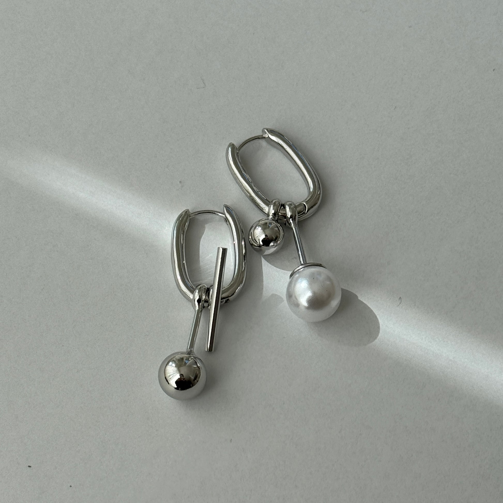 エッジの効いたシルバーにパールをアシンメトリーに配置した、曲線と直線が織りなすモードなピアス。