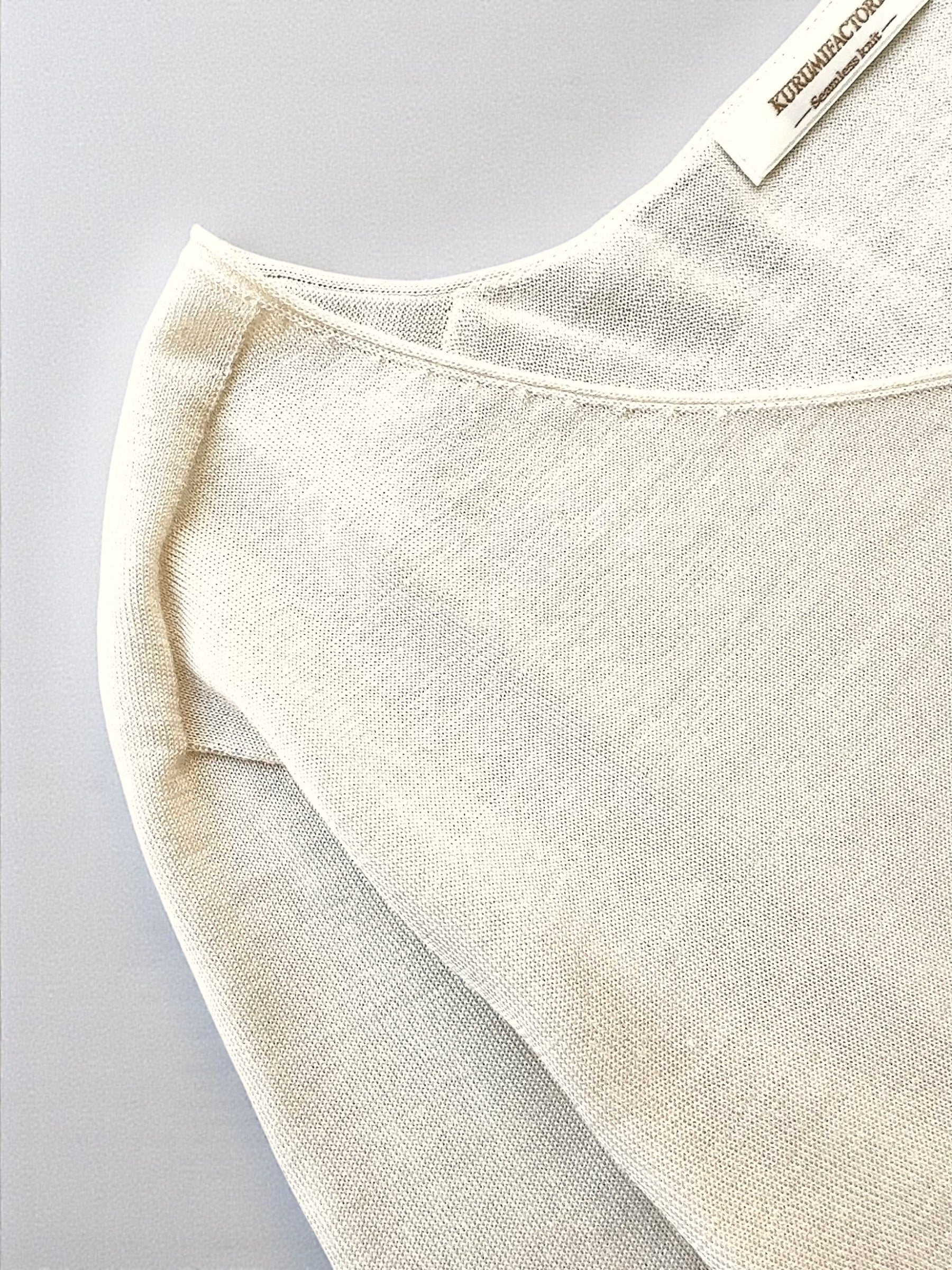 本製品には、養蚕から紡績まで国内一貫で生産される、純国産の絹紡糸メーカー〈中川絹糸〉のプライムシルクを使用。日本のニットファクトリー〈寺田ニット/KURUMIFACTORY〉にて丁寧に仕立てられており、