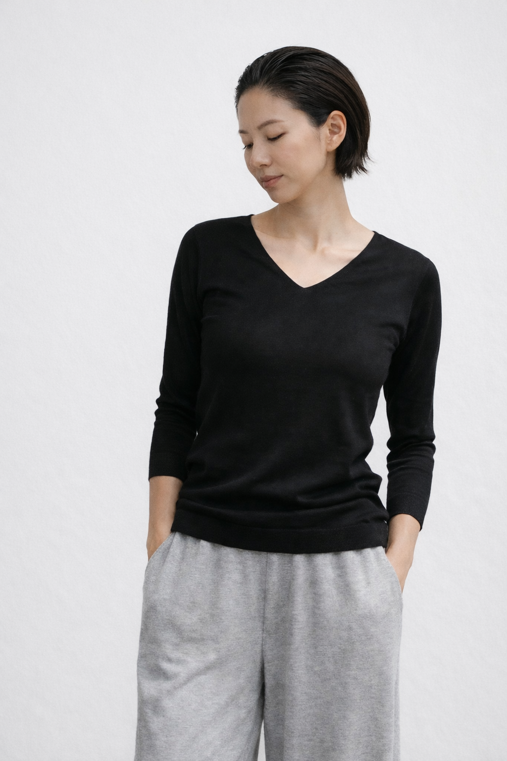 ウォッシャブルシルク 七分袖カットソー(Vネック)