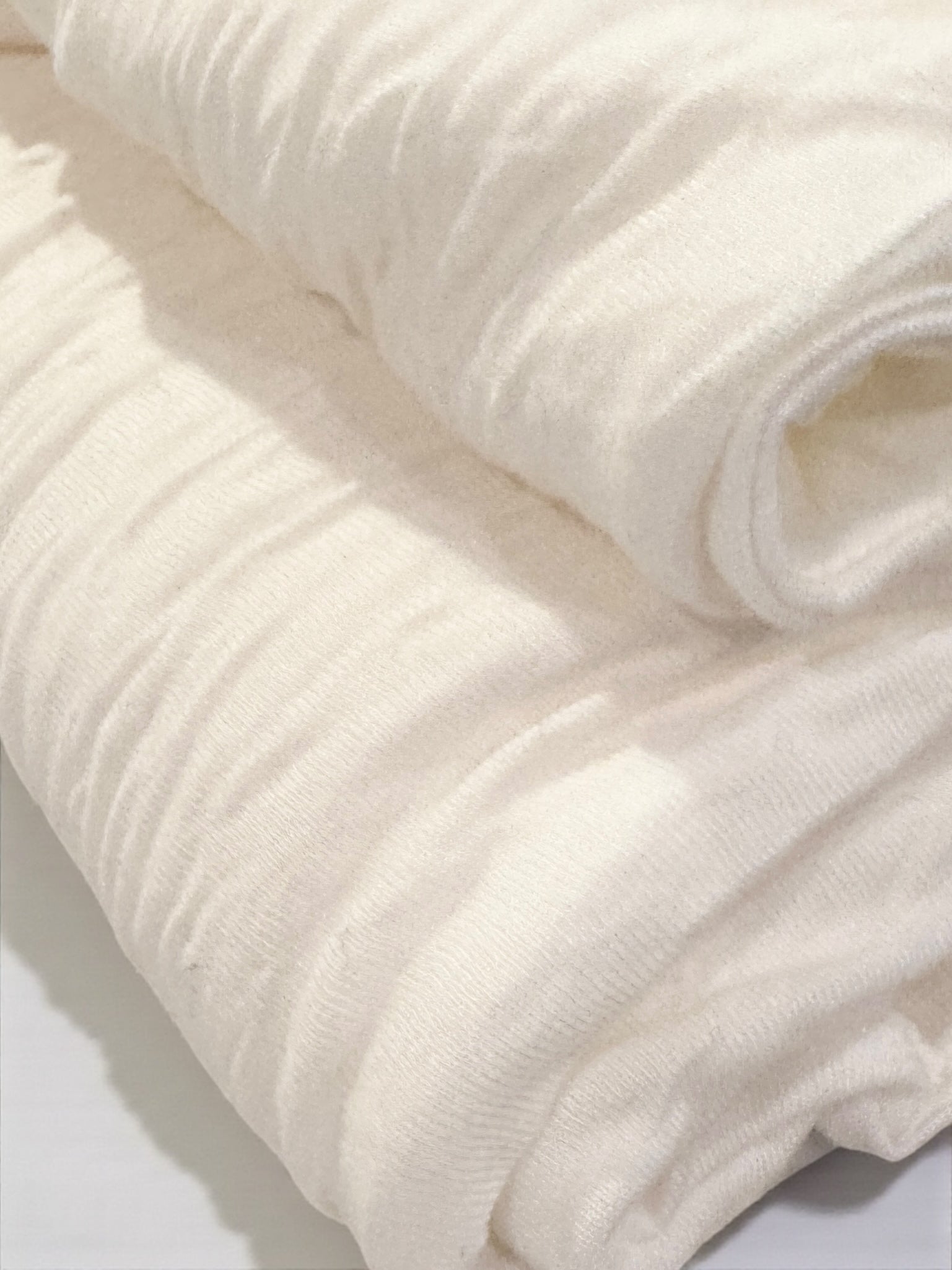 従来のシルク真綿に比べ、かさ高で暖かく、ふんわりとした風合いと、圧縮回復性に優れ、へたりにくい特長があります。
