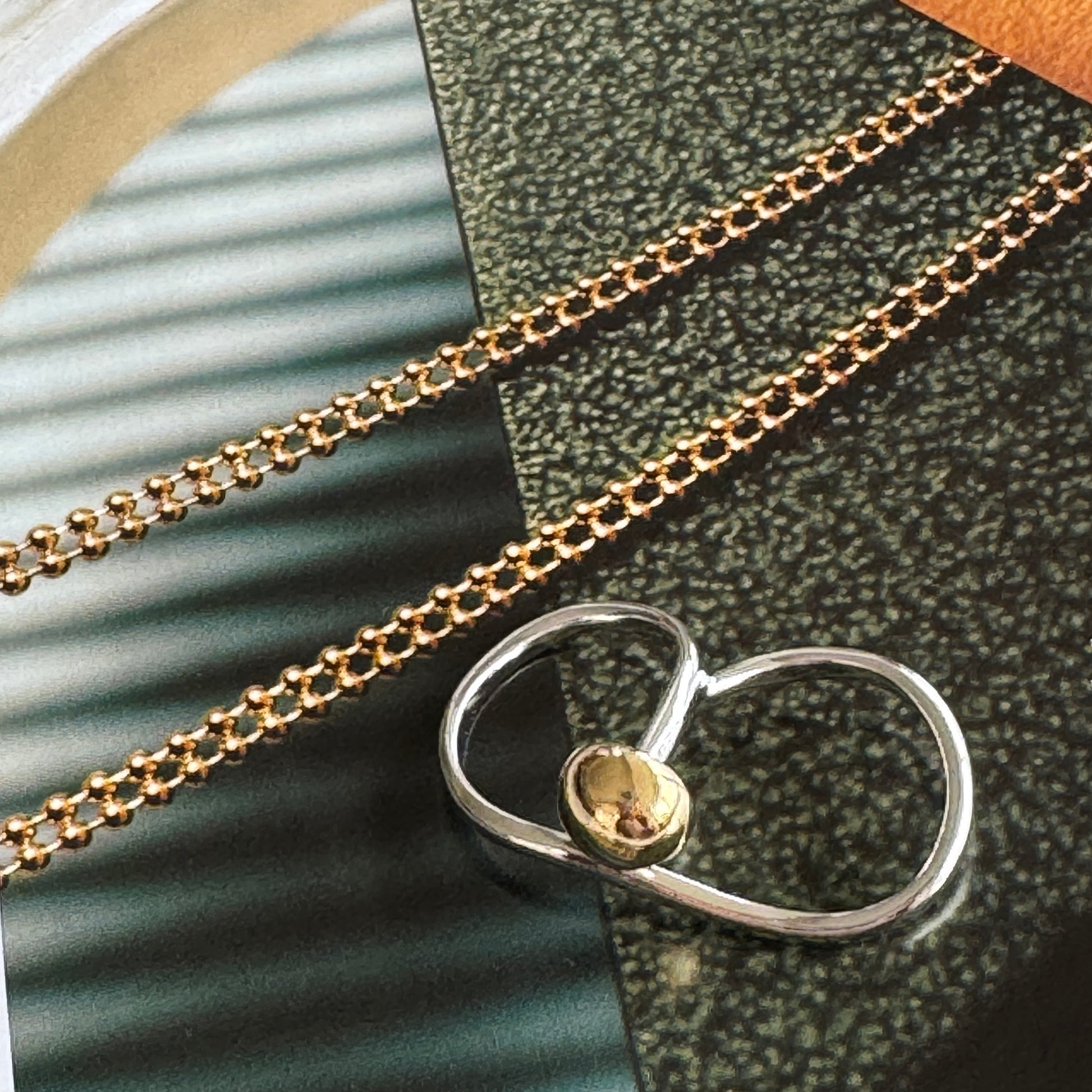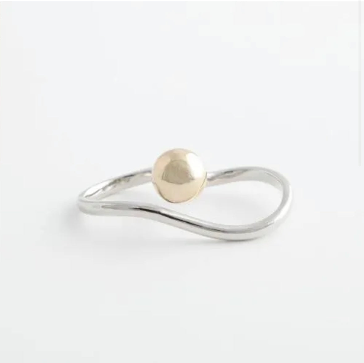 シルバー×ゴールドのミックスカラーが洗練された存在感を放ち、シンプルながらも個性を引き立てる、SHIMMER & MUSEらしいデザインリングです。